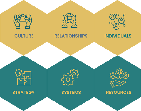 This evidence-based diagnostic tool analyzes the six core drivers of organisational success: Culture, Relationships, Individuals, Strategy, Systems, and Resources.